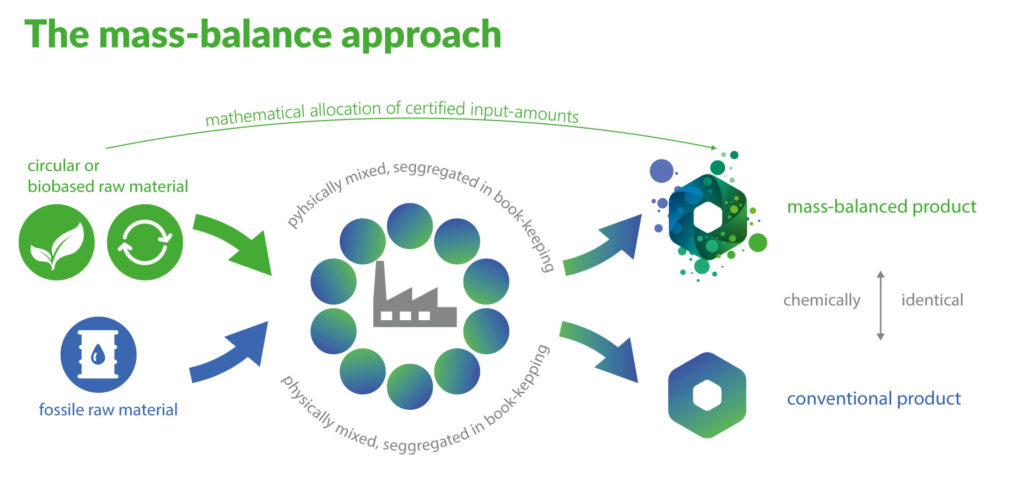 The concept of mass balancing makes it possible to integrate sustainable raw materials such as bio-naphtha into existing, highly efficient production facilities right at the start of the value chain, thereby gradually replacing fossil resources. The proportion of sustainable raw materials is allocated to specific end products on a mathematical basis.